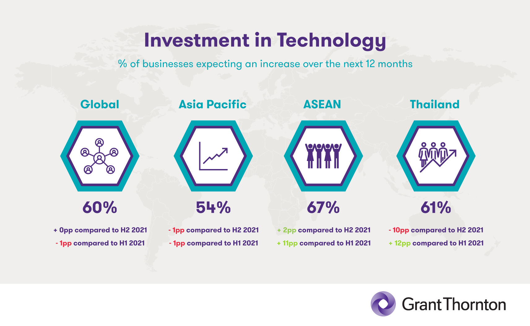 Even more encouraging numbers are reflected in mid-market sentiment surrounding investment in technology, where ASEAN’s score of 67% indicates an increase of 2pp, while also beating the global average of 60%. Indeed, ASEAN’s tech investment has continued to increase since the onset of the pandemic, and the region remains suitable for investment in technology – especially for tech startups.
