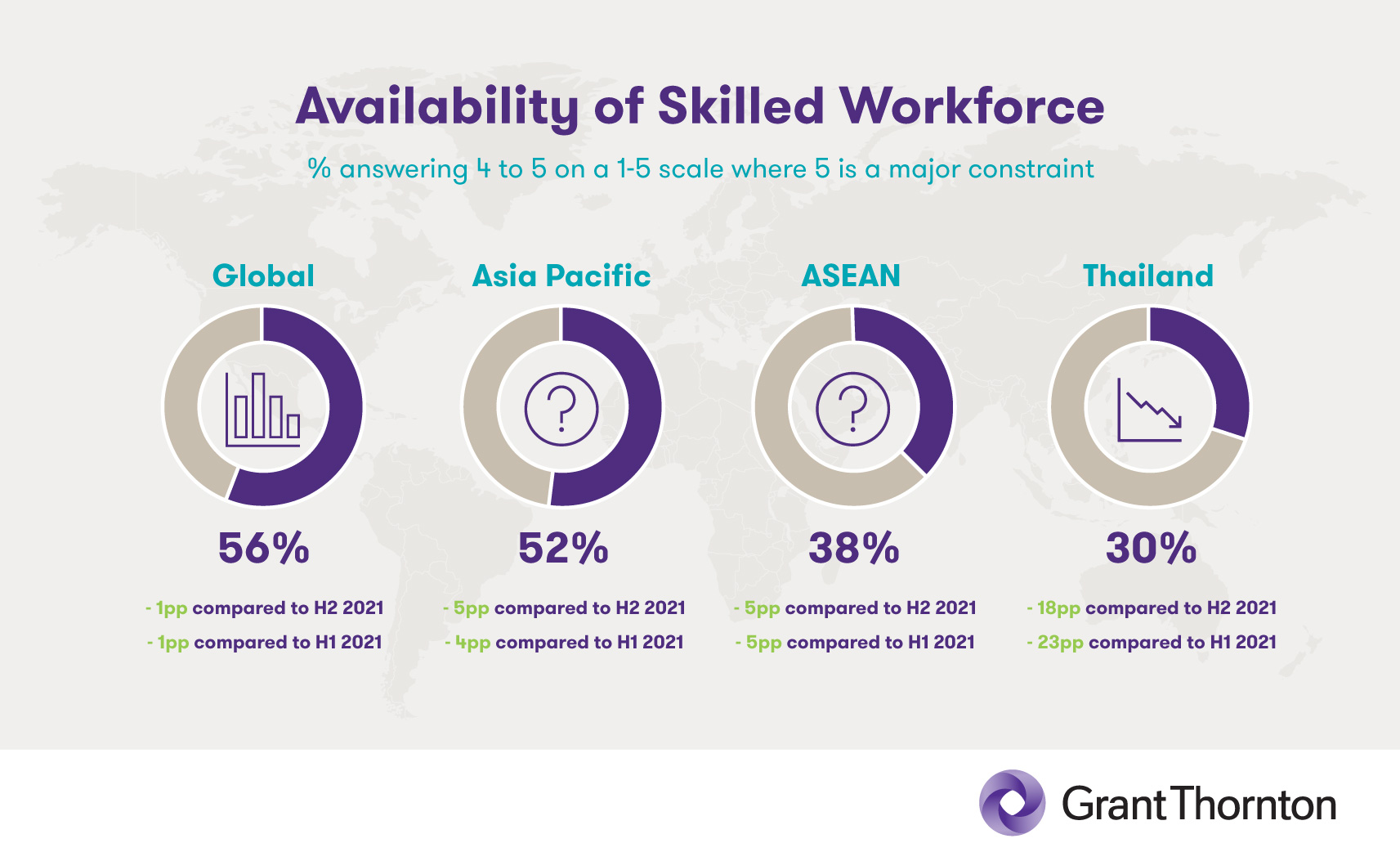 Optimism levels surrounding employment reveal similar trends, with ASEAN countries evidently feeling the pinch from the Great Resignation. Business sentiment on this topic currently stands at just 52% – a 5pp decline when compared to H2 2021. Respondents indicated greater levels of optimism (62%) on the question of investment in staff skills – a figure which is higher than the global, Asia-Pacific, and Thailand averages – though the current ASEAN score represents neither an increase nor a decrease from its own total in H2 2021.