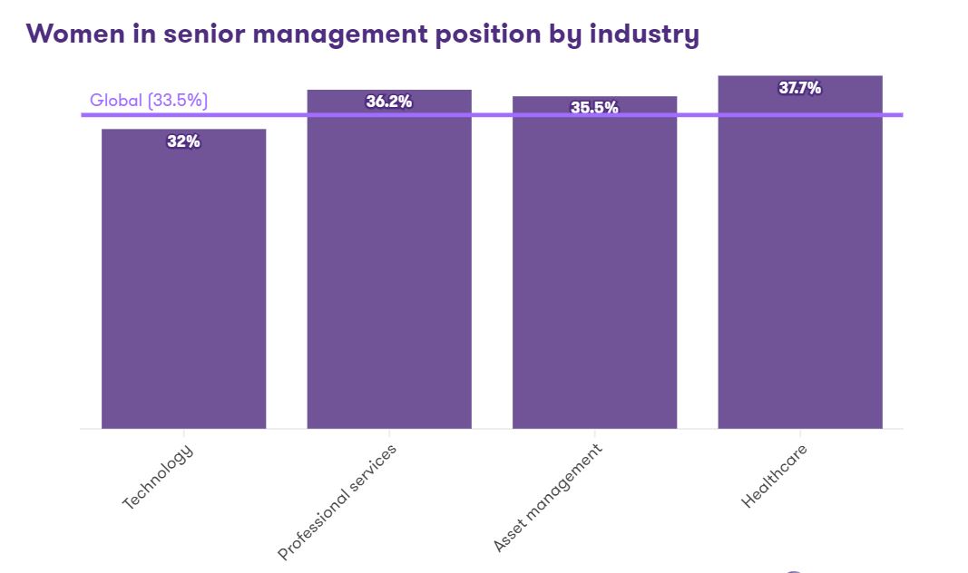 Globally, women hold 32.0% of senior management positions in the tech sector, below the global average of 33.5%, and below other industries such as professional services (36.2%), asset management (35.5%), and healthcare (37.7%).