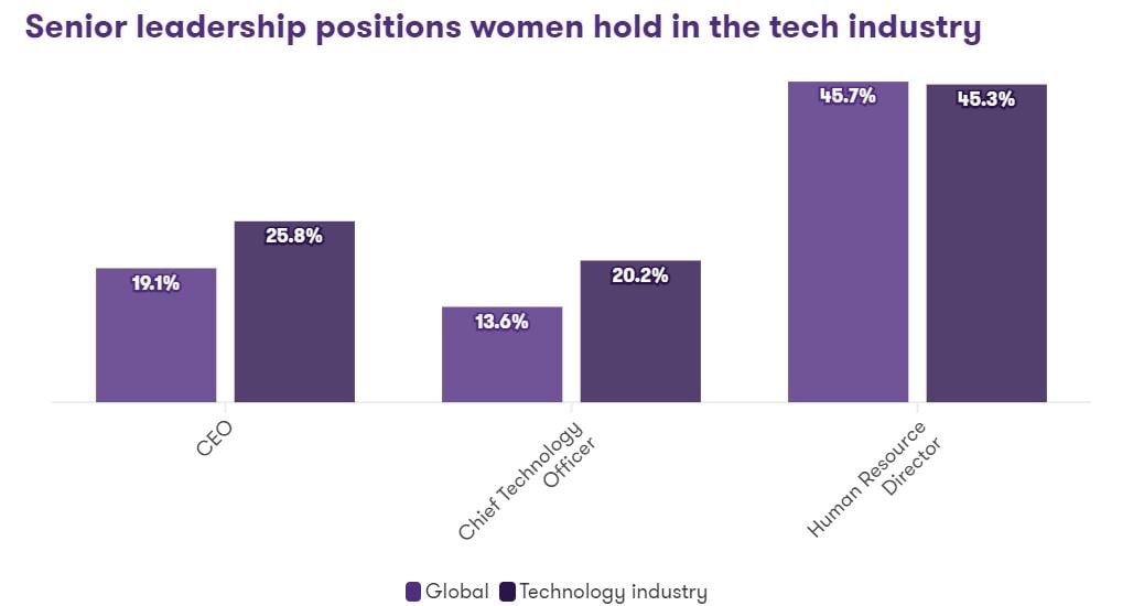 When looking at which senior management positions women hold in the tech sector, it is clear more must be done to ensure women are closer to the development of the technology itself. Women hold just 20.2% of Chief Technology Officer positions in mid-market tech firms and 25.8% of CEO positions, compared to 45.3% of Human Resources Director positions.