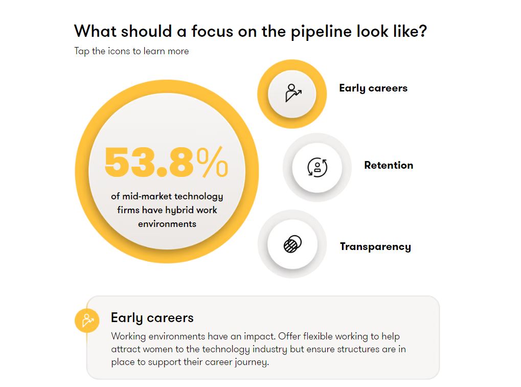 More must be done to get women into senior leadership positions that are close to the development of new technology, to ensure it is developed equitably. Therefore, we’ve identified three areas for mid-market firms to focus on to help women reach positions in the tech sector that can influence the development of AI, and boost innovative thinking: Early careers, retention and transparency.
