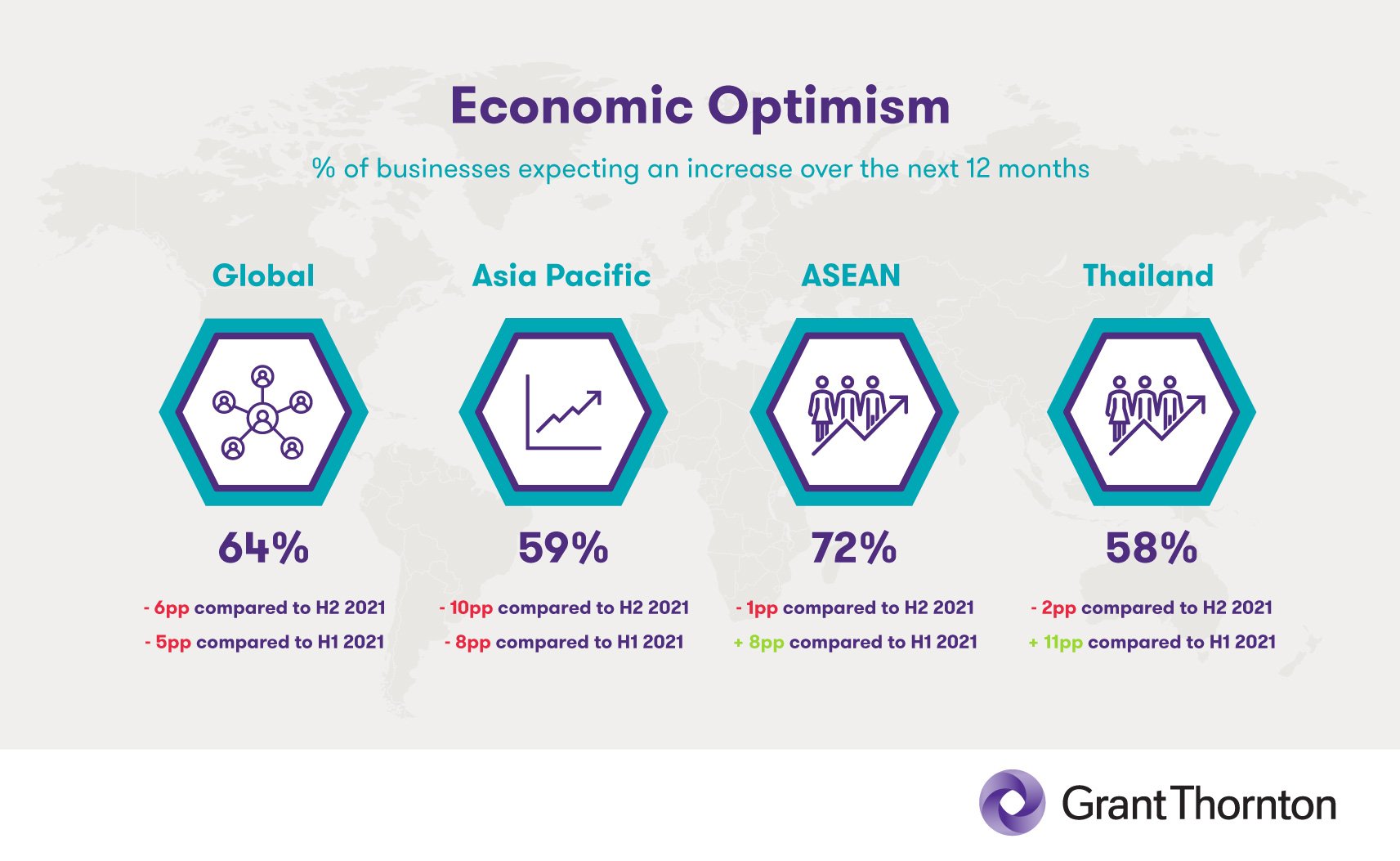 ASEAN countries are showing rapidly increasing levels of economic optimism – with 72% of respondents indicating a sentiment of overall optimism moving forward, alongside a 8pp increase from H1 2021.