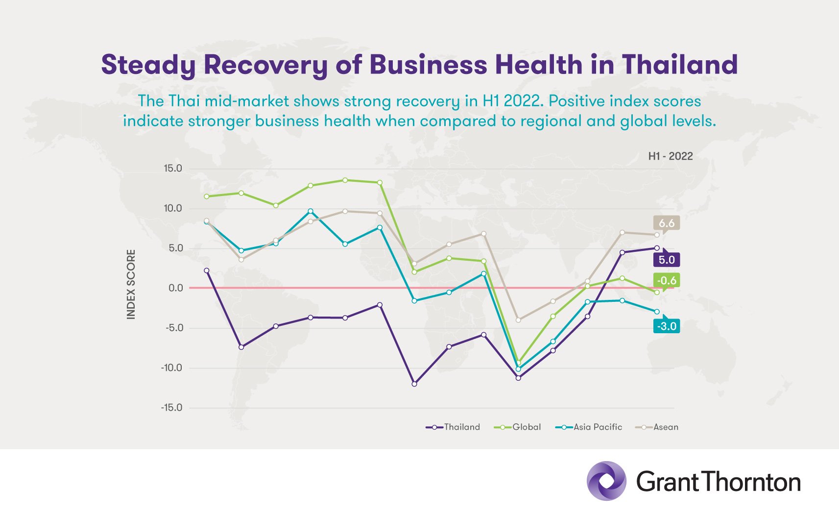 Grant Thornton in Thailand is proud to present the International Business Report (IBR) findings for H1 2022. This report features exclusive analysis from our survey of 10,000 mid-market businesses, as well as over 100 interviews with company leaders across sectors. In it, we review industry sentiment toward business opportunities as well as restrictions for the coming 12-month period. The IBR reflects current levels of business optimism, while also examining several macroeconomic factors that cause this optimism to increase or decrease across various regions.