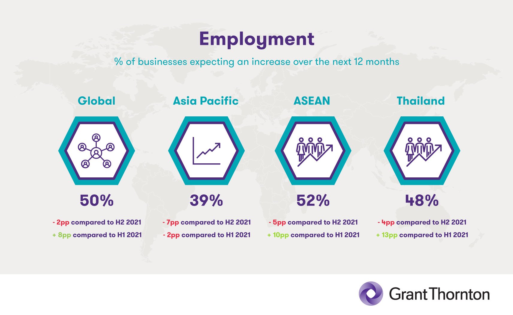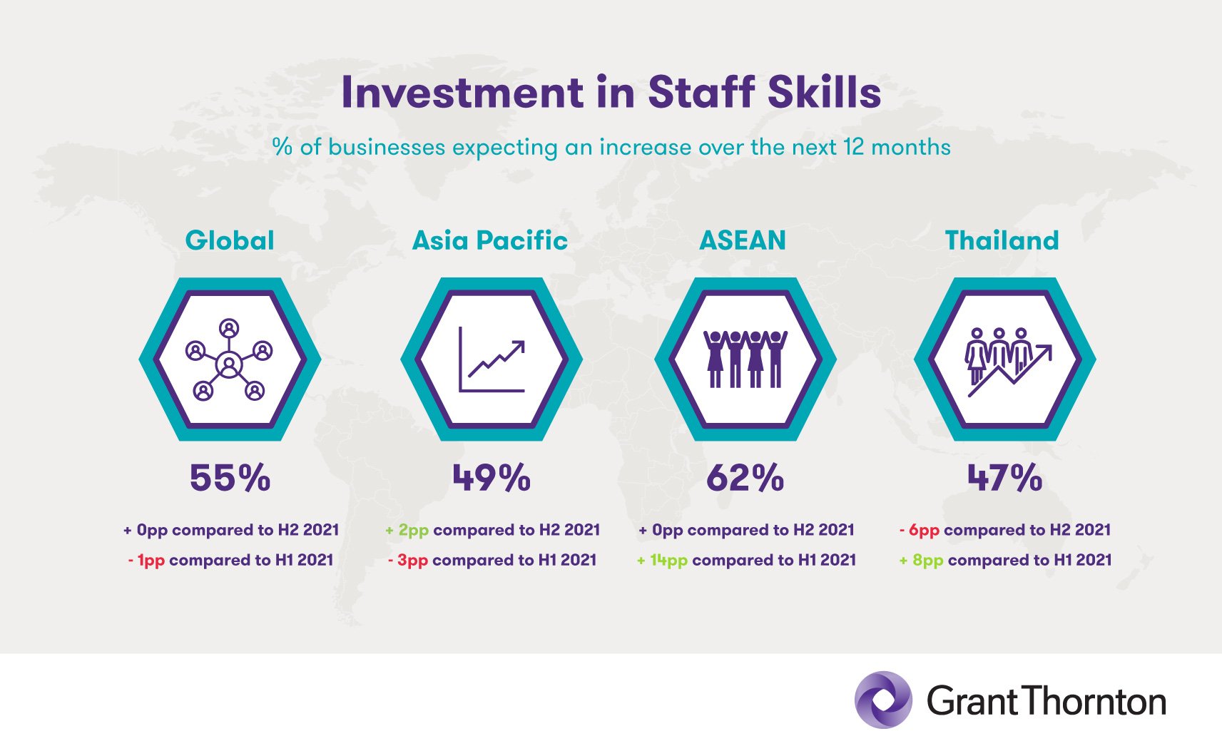 Optimism levels surrounding employment reveal similar trends, with ASEAN countries evidently feeling the pinch from the Great Resignation. Business sentiment on this topic currently stands at just 52% – a 5pp decline when compared to H2 2021. Respondents indicated greater levels of optimism (62%) on the question of investment in staff skills – a figure which is higher than the global, Asia-Pacific, and Thailand averages – though the current ASEAN score represents neither an increase nor a decrease from its own total in H2 2021.