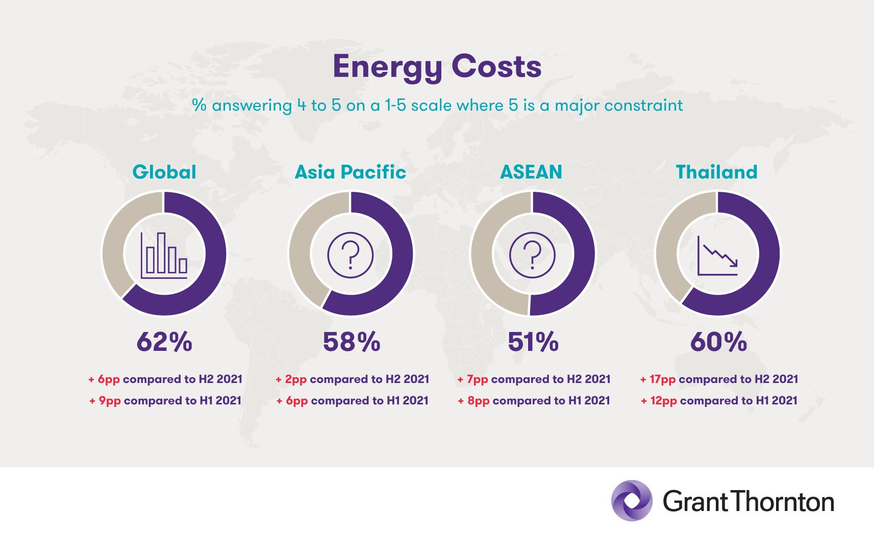 Still, the constraints to business growth that are affecting the global business world are equally evident within ASEAN’s borders. These include the cost of energy, which now counts as a significant concern for 51% of the ASEAN business leaders we surveyed – fully 7pp higher than the region’s H2 2021 totals.