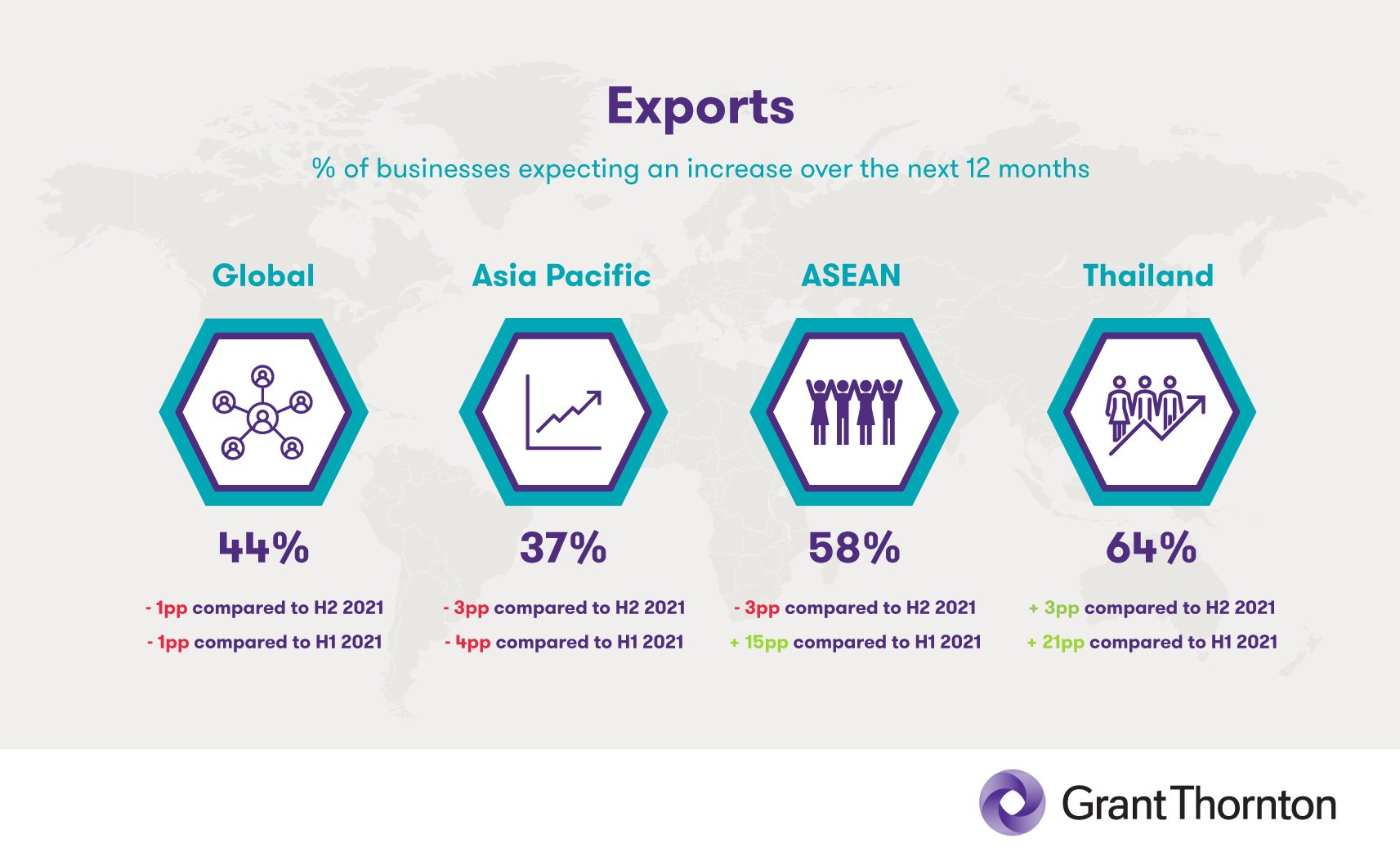 This reserved perspective is reflected in other indicators such as exports and profitability, which have also dropped modestly when compared with last year. Export sentiment worldwide for the coming 12 months is at 44% (a drop of 1pp from H2 2021), and at just 37% for Asia-Pacific (a drop of 3pp over the same period). In terms of profitability, global mid-market companies yielded a score of 54% (a drop of 3pp from H2 2021), while those in Asia-Pacific saw their total fall 1pp to 50%.