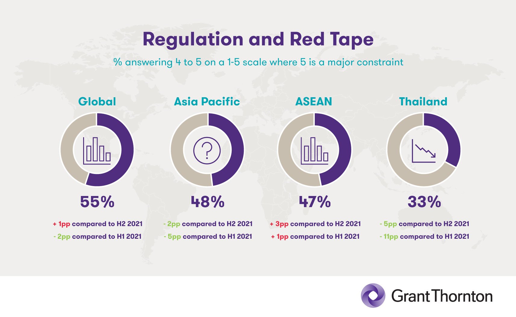 47% of ASEAN business leaders see regulations and red tape as a constraint to their businesses – a 3pp increase over the previous period, although this number may decrease in the coming months as most or all remaining pandemic-related travel restrictions are lifted. ASEAN already scores better on this metric than its global and Asia-Pacific counterparts – where 55% and 48% of business leaders express concern on this issue, respectively.
