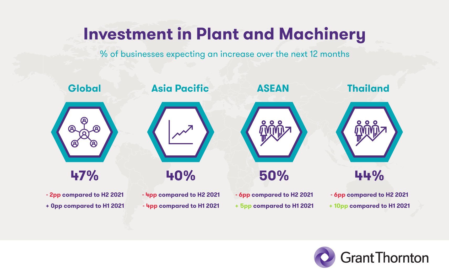 In terms of investment in plant and machinery, ASEAN’s current score of 50% represents a fall of 6pp from H2 2021. This decrease may be attributable to supply-side tension and cost-push inflation in the global economy.