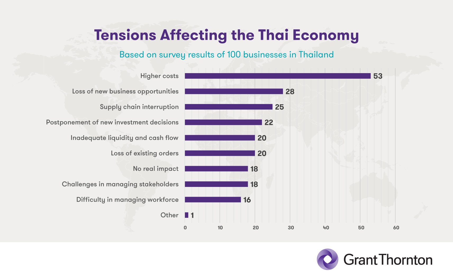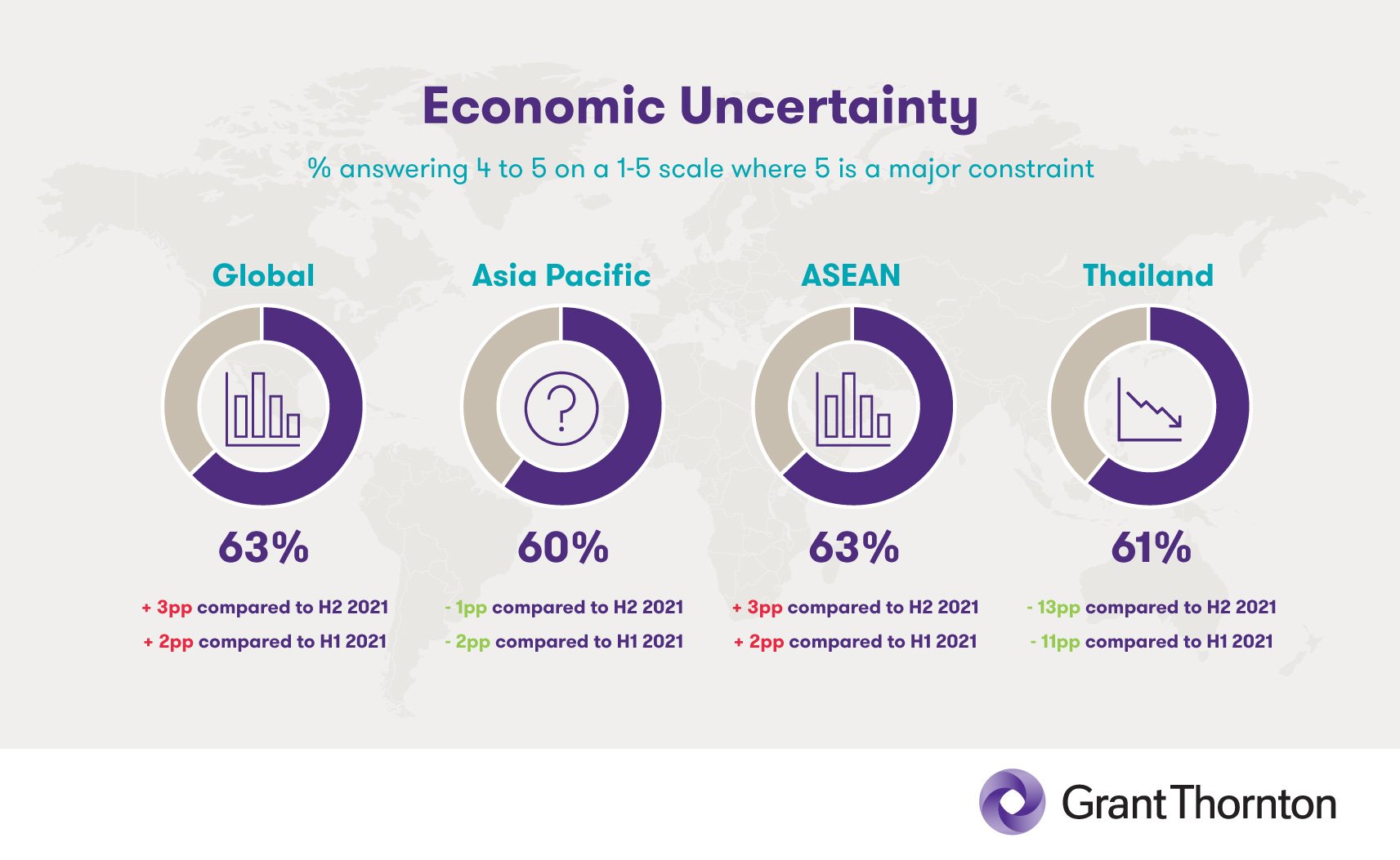 Significant constraints to business growth are listed below, and include challenges situated both inside and outside of Thailand. Each of them nevertheless contributes to the metric of general economic uncertainty, a measurement which has dramatically decreased in Thailand since H2 2021. This 13pp drop in economic uncertainty brings Thailand down to 61%, still high although fully in line with regional and worldwide averages.