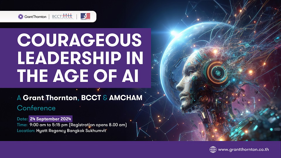 Grant Thornton, BCCT & AMCHAM are thrilled to invite you to our upcoming full-day conference, "Courageous Leadership in the Age of AI," on Tuesday, 24th September 2024 at the Hyatt Regency Bangkok Sukhumvit. This event is designed to inspire and equip leaders with the insights and tools needed to navigate the rapidly evolving landscape of artificial intelligence.
