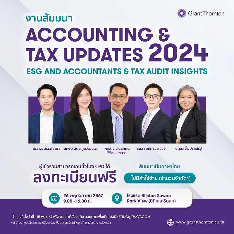 Grant Thornton will be holding the Accounting & Tax Updates 2024 Seminar on the topic “ESG and accountants & Tax audit insights” on Tuesday, 26 November 2024, from 0900 to 1630 hours at Bliston Suwan Park View Hotel, Bangkok.