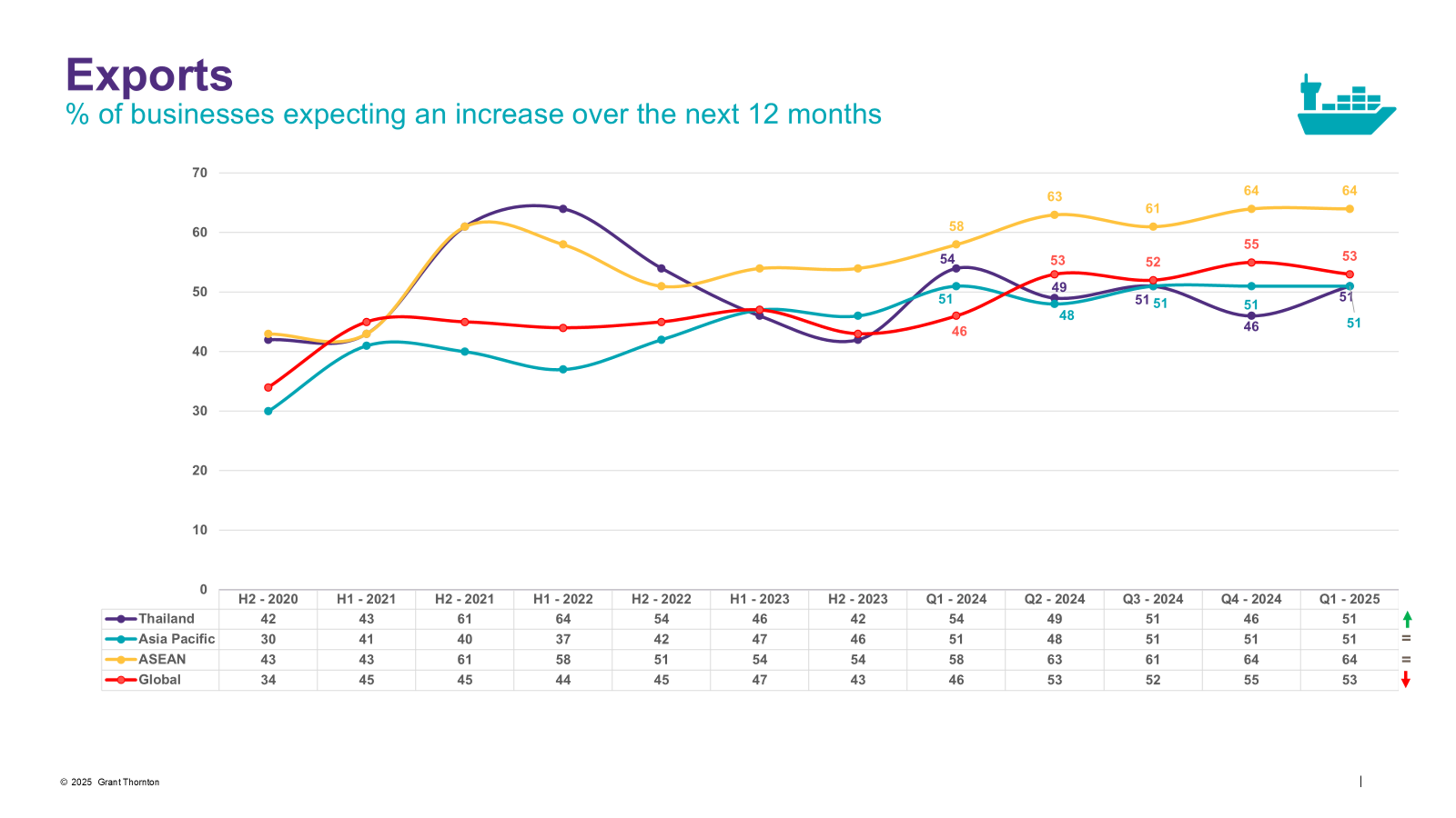 - Exports: Only 51% of Thai businesses expect export growth, significantly behind ASEAN (64%) and slightly below global (53%) expectations, though on par with the Asia-Pacific average (51%).