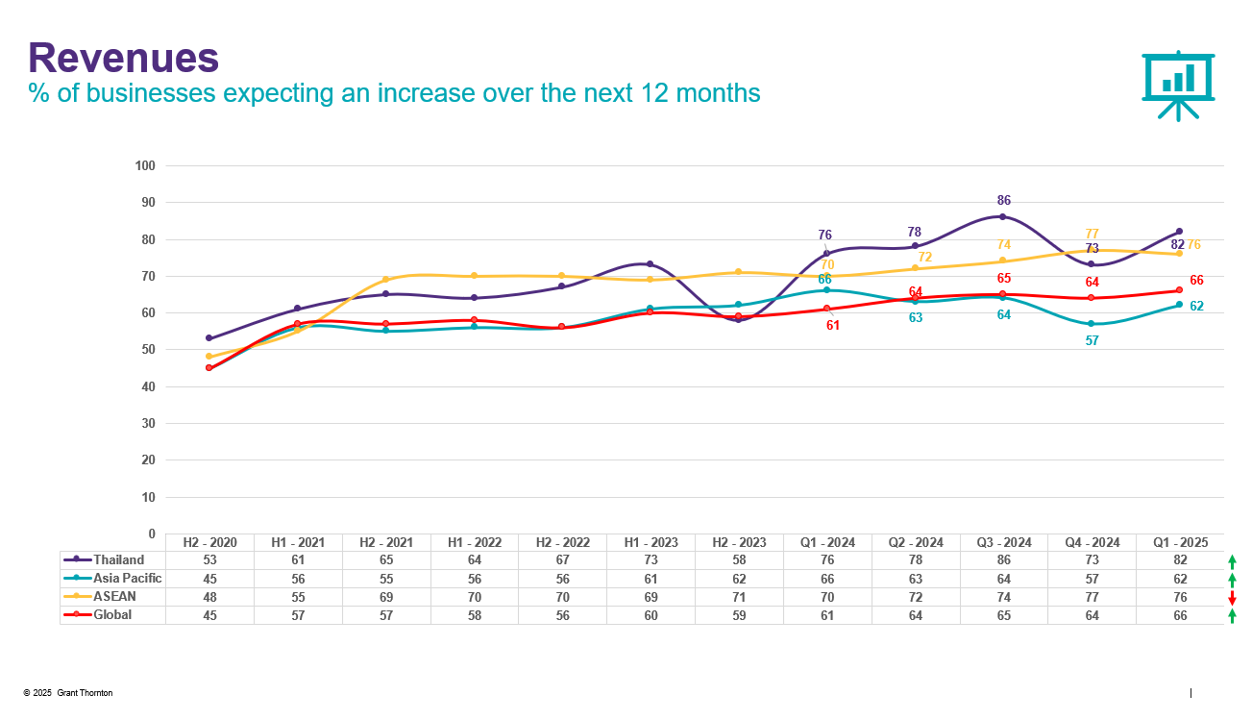 - Revenue growth: Thai businesses show stronger optimism here, with 82% anticipating growth, higher than ASEAN (76%), and substantially above Asia-Pacific (62%) and global (66%) averages.
