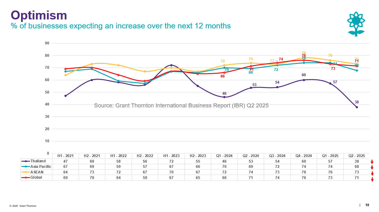 Only 38% of Thai businesses expect the economy to improve over the next 12 months, down from 57% in Q1. This is far below sentiment in ASEAN (73%), Asia Pacific (68%), and global (71%) peers. The trend reflects growing domestic and international pressures, including political uncertainty, rising trade tensions, and concerns over debt and regulatory complexity.