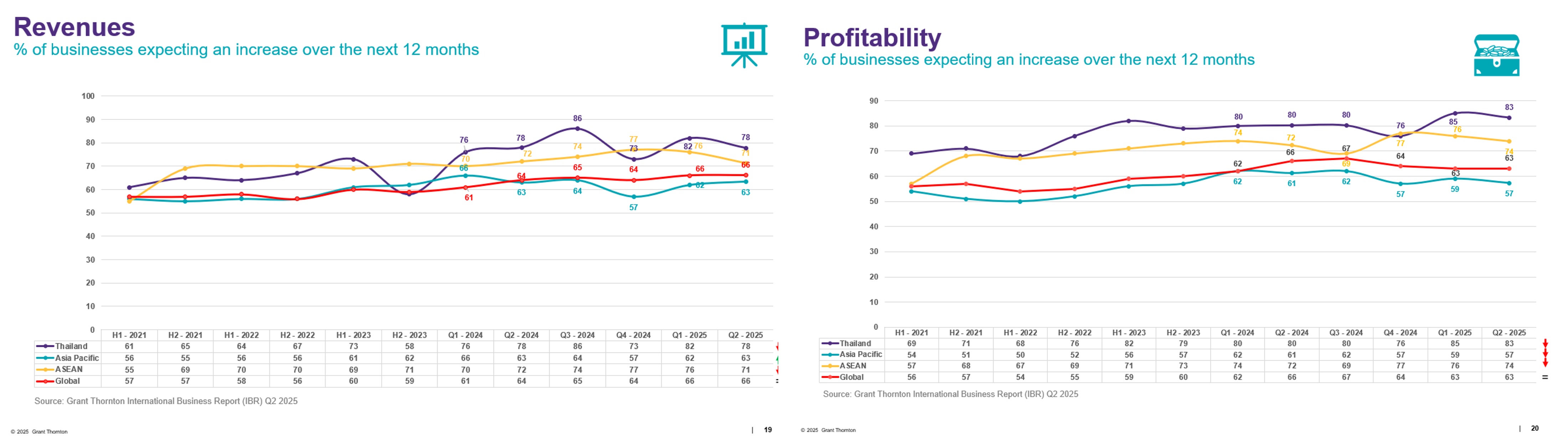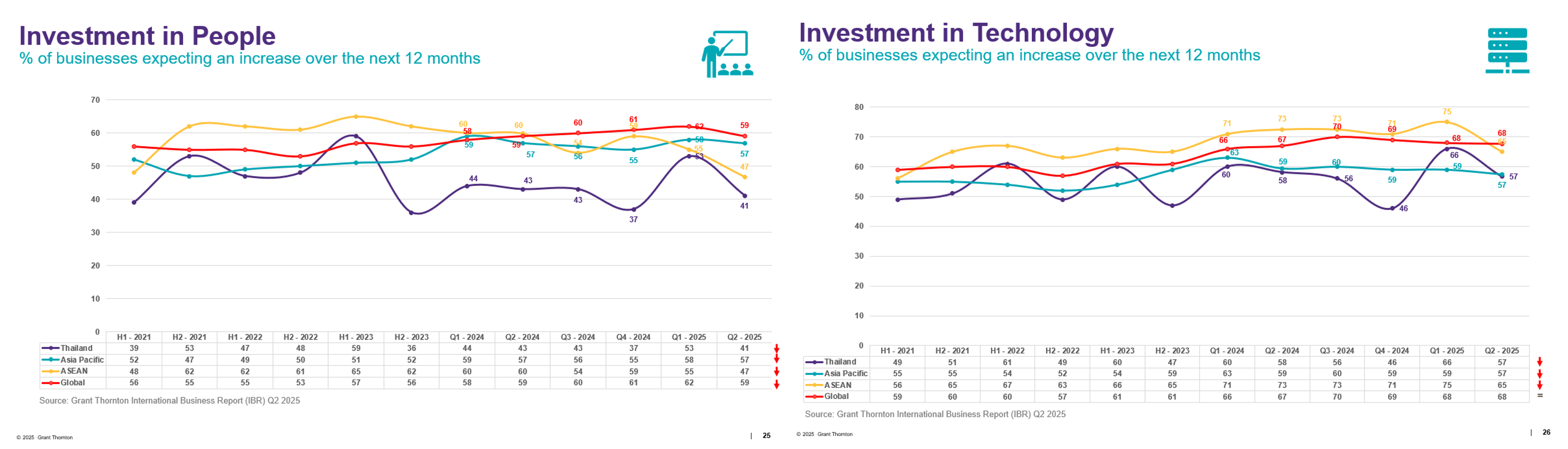 Ian Pascoe, CEO and Managing Partner at Grant Thornton in Thailand, commented: “This quarter’s data highlights an increasingly cautious business community. Thai firms continue to report strong expectations for profitability and revenue, but their reluctance to invest in people, technology, and R&D suggests a mismatch between ambitions and actions. Confidence is a good starting point, but execution is what counts – especially in a region where competition is intensifying and structural challenges persist.”