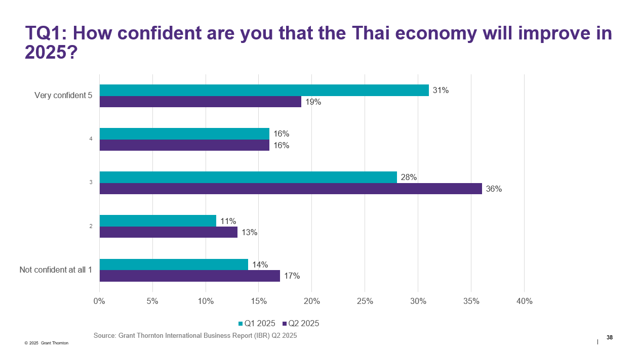 According to the latest Grant Thornton International Business Report (IBR), conducted between 16 April and 29 June 2025, Thai mid-market businesses are navigating a more uncertain economic landscape. The percentage of leaders “very confident” in economic improvement dropped sharply to 19%, down from 31% in Q1. A plurality of respondents (36%) are now “unsure,” while 17% report having no confidence at all.