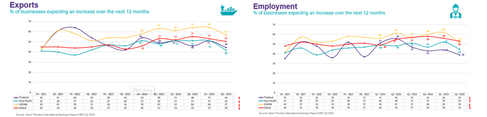 However, this self-assurance is not mirrored in other areas and is possibly more hope than reality. Only 44% of Thai firms expect export growth – down from 51% in Q1 and now below both ASEAN (57%) and global (50%) expectations. Employment growth projections have also weakened, falling to 39% in Q2, significantly behind ASEAN (52%) and global peers (52%).