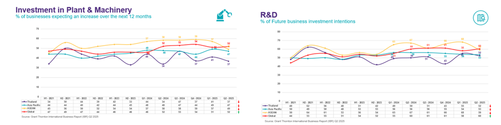 Other critical growth areas are showing similar retrenchment. Just 37% of Thai firms plan to increase investment in plant and machinery, well below the global average of 52%. Meanwhile, R&D investment intentions fell slightly to 52%, trailing ASEAN (59%) and global peers (60%).