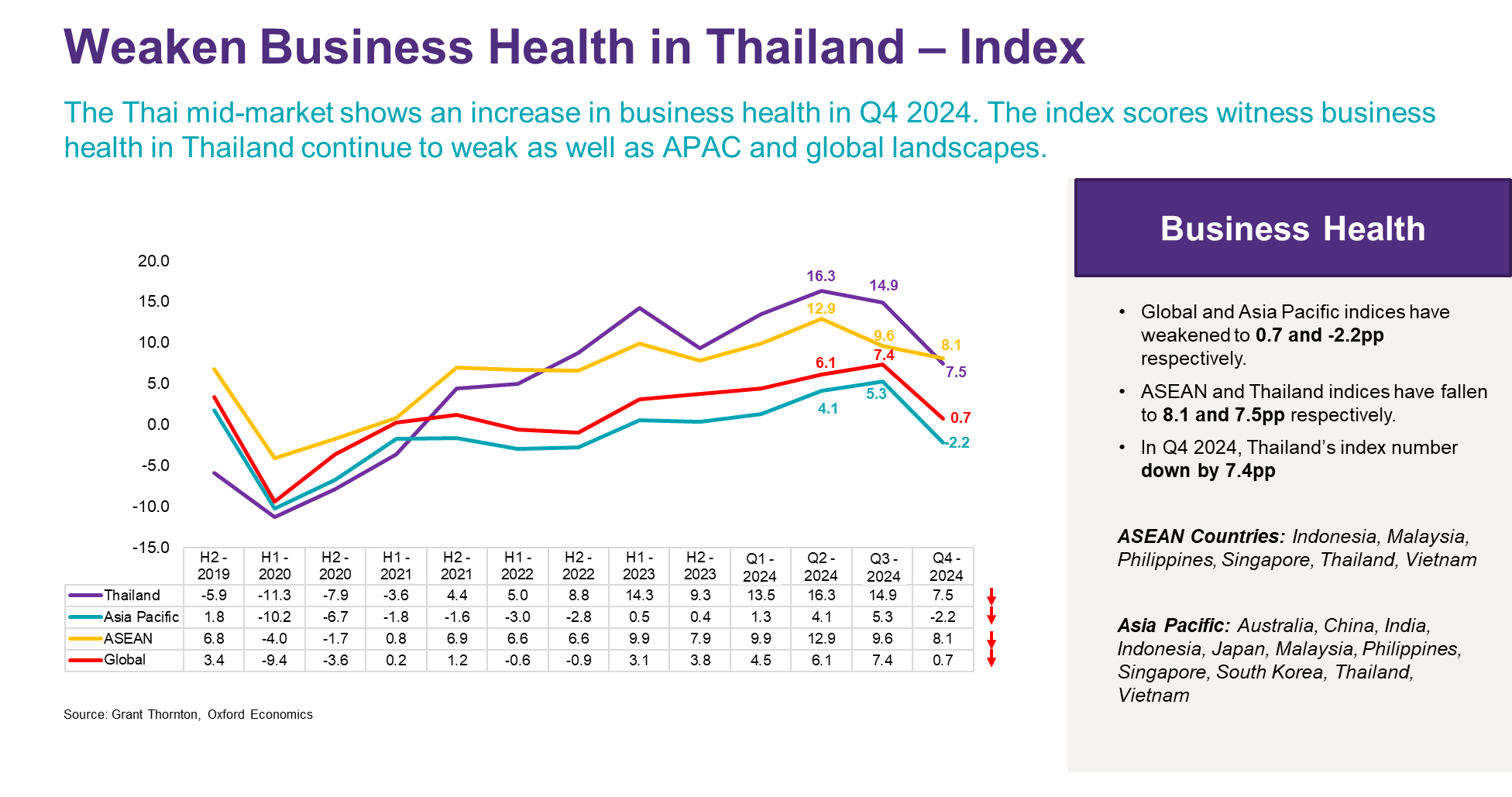 The Grant Thornton International Business Report (IBR) has provided insights into mid-market sentiment globally since 1992. The Q4 2024 research is based on interviews with 90 mid-market business leaders in Thailand, conducted between 2 October and 8 November 2024. The data, analysed in collaboration with Oxford Economics, evaluates business health, investment trends, and key growth constraints.