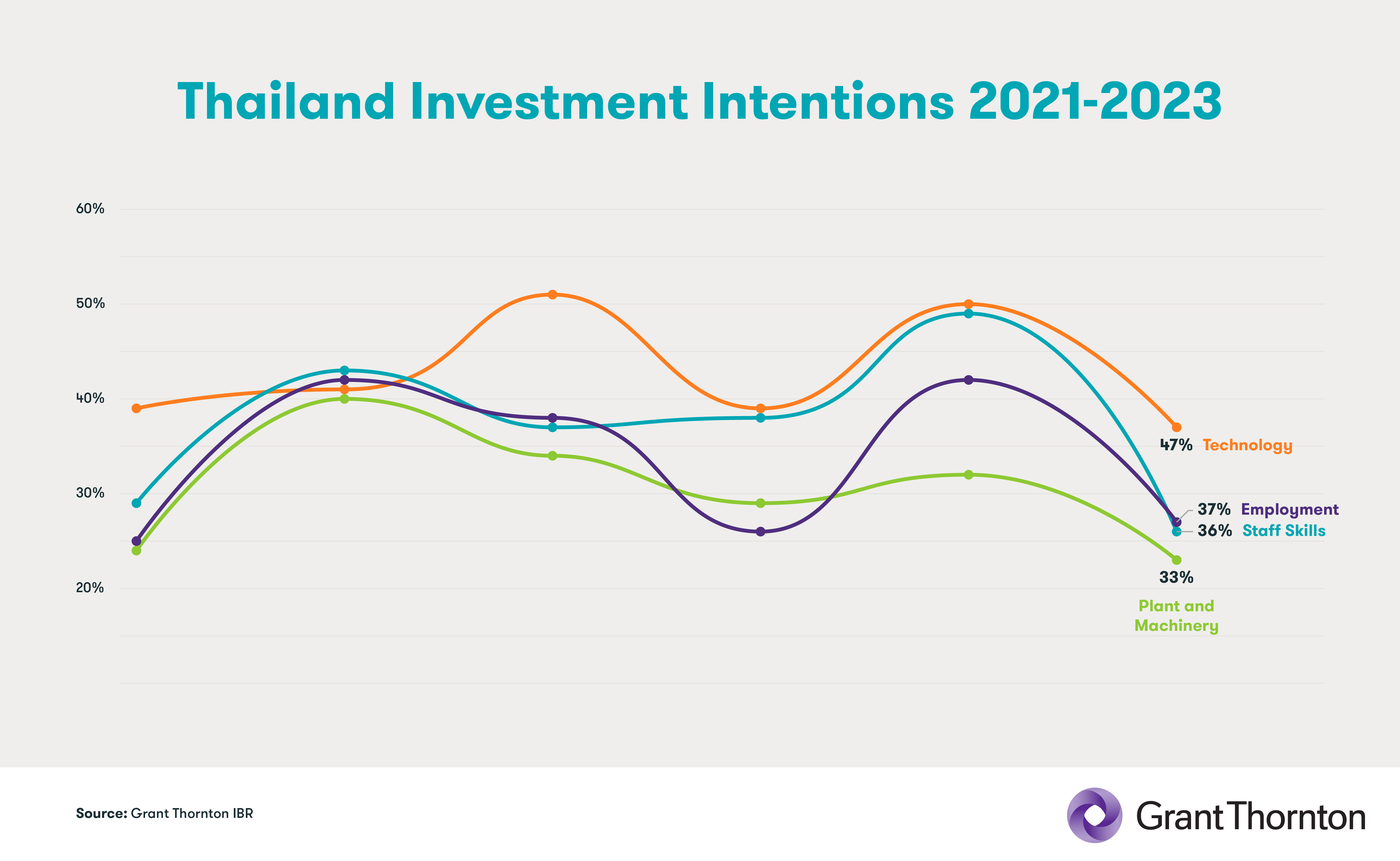 According to the survey responses, investment intentions of mid-market businesses are steering in the wrong direction. The evident decline in intent to invest in staff skills, technology, and plant & machinery, all plummeting by over 10 percentage points, paints a picture of the Thai economy akin to a dwindling flame losing its radiance. The bleak outlook is worsened by neighbouring economies' persistent growth, potentially pushing Thailand – a once vibrant and booming economy – into the background. Evidently, Thai businesses must prioritise strategic investments in innovation and workforce development, while the government reevaluates and enacts its fiscal stimulus policies, to ensure the economy’s resurgence and lasting prosperity.