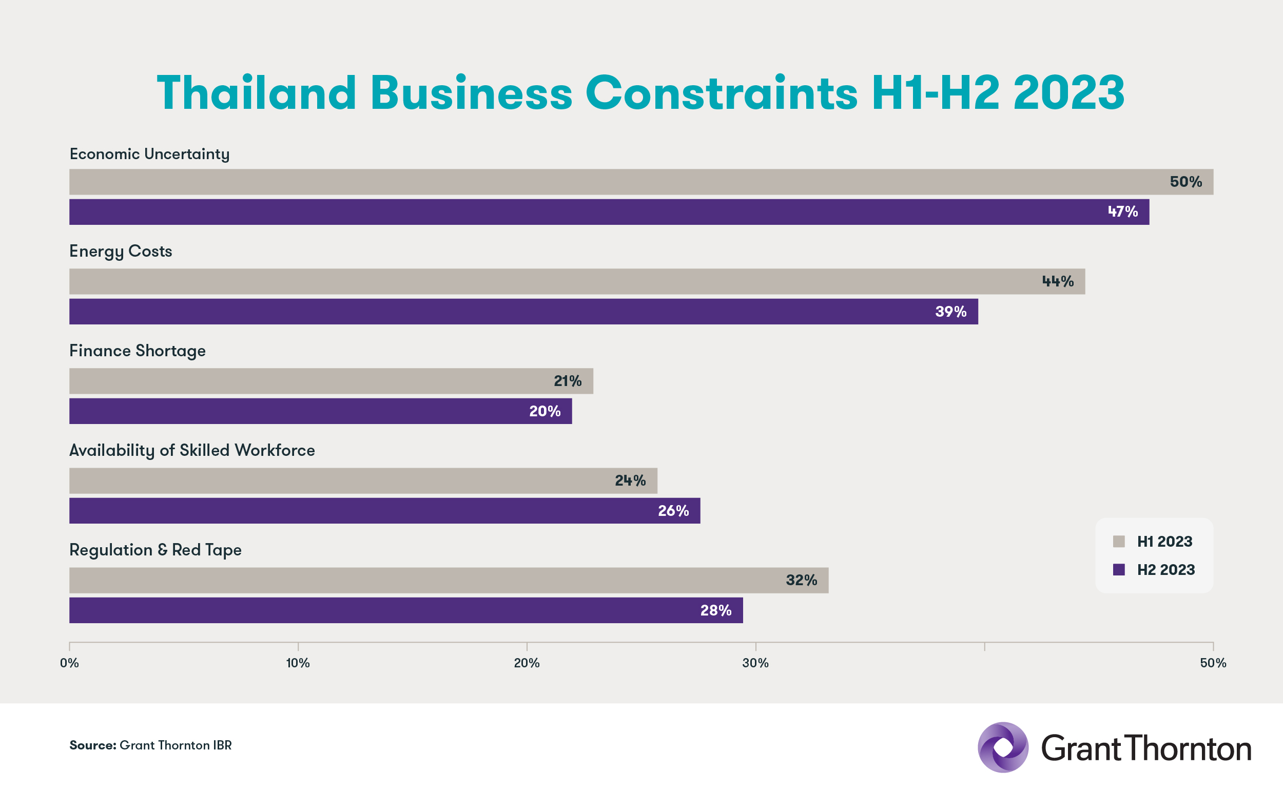 Amidst the constraint indicators, where lower scores indicate better performance, economic uncertainty remained relatively low in Thailand compared to regional and global averages, scoring 47% overall (slightly better than in the previous period). Other loosening constraints on mid-market business growth in Thailand include regulation & red tape (from 32% to 28%), finance shortage (21%), and energy costs (44% then, 39% now).