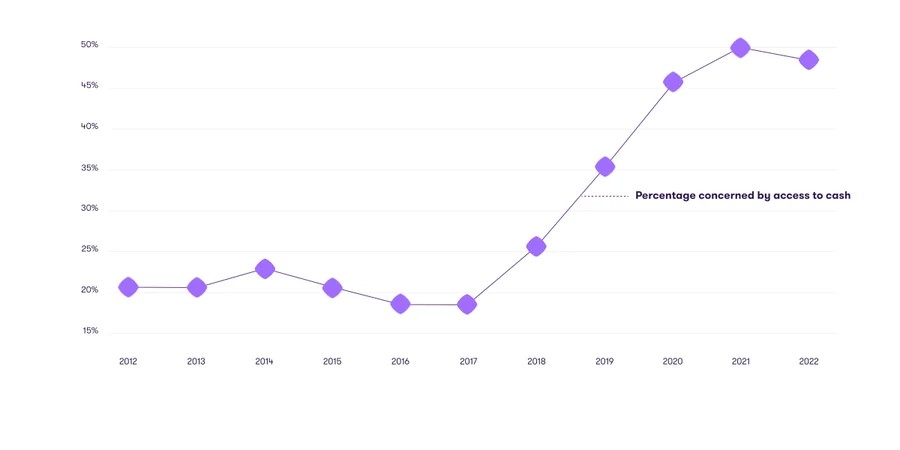 Global percentage concerned by access to cash (data over time – last 11 years)