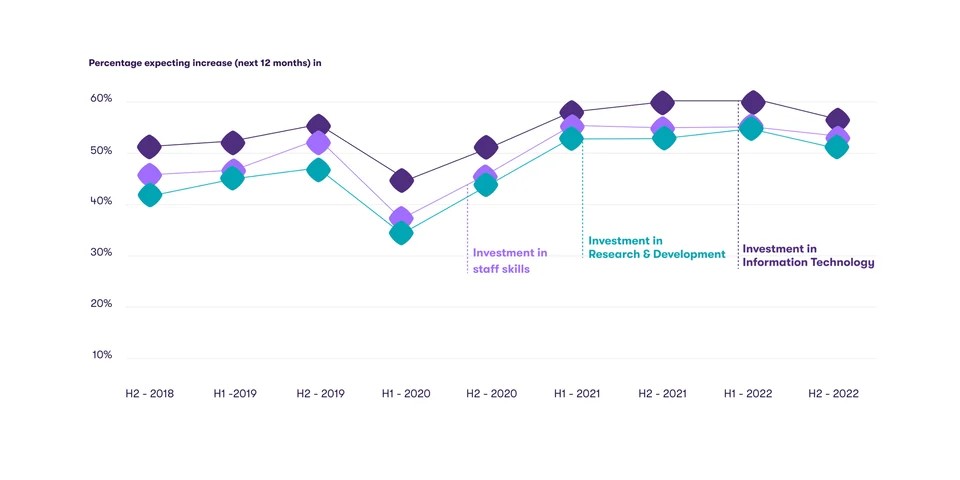 According to the latest data from the International Business Report (IBR), Grant Thornton’s global survey of mid-market companies, business leaders are being cautious about their future investment intentions. Across the board, in the second half of 2022 plans to invest were slightly down compared to H1 2022. Investment in staff skills has fallen by 2% to 53%, research and development intentions are down by 4 points to 51% and investment in technology is down by 3% to 57%.