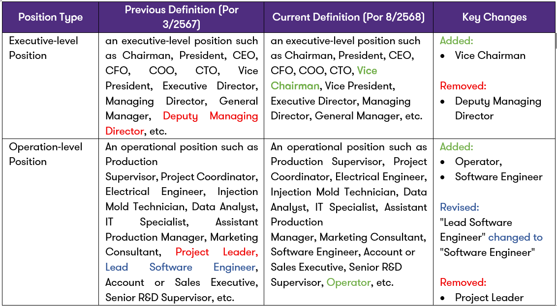 On 5 June 2025, the Board of Investment (“BOI”) published Announcement No. Por 8/2568, by virtue of the Investment Promotion Act B.E. 2520 (1977). This announcement revises the Criteria for Approval of Positions for Foreign Nationals, Placement of Foreign Nationals in Approved Positions, and Extension of Position Terms and Personnel under Sections 25 and 26.
