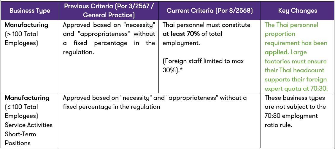 The new announcement shifts from a purely "necessity-based" assessment to a "quota-based" system, particularly for the manufacturing sector. The most critical update is the explicit requirement for the proportion of Thai employees.