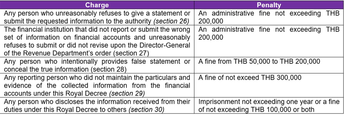 This Royal Decree may not only focus on the financial institutions but also on the entity or individual who is a taxpayer in preparing to comply with any request or demand from the tax authority in submitting the information upon request. The Thai Revenue Department can currently investigate the taxpayer’s financial accounts across the jurisdiction and vice versa for other countries’ Revenue Departments. There may be a situation that Thai taxpayers need to be aware of the correctness of the report of their offshore bank account information. The correct information will ensure compliance under the Thai tax law to avoid any administrative fine, penalty or imprisonment that they may be exposed to.