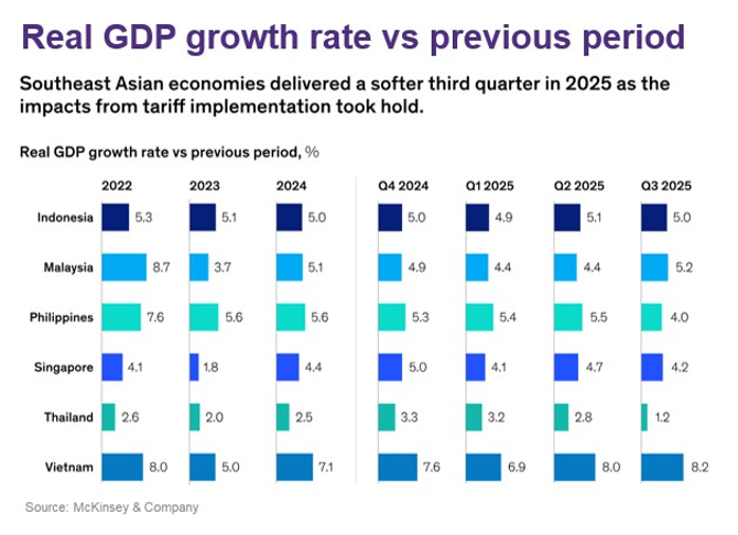 This divergence in optimism is mirrored in regional economic performance. Real GDP growth across Southeast Asia moderated in the third quarter of 2025 as tariff effects weighed on momentum. Vietnam led the region at 8.2 percent, while Malaysia and Indonesia remained stable at 5.2 percent, its weakest performance since 2021. The widening performance gap highlights intensifying competitive pressure within ASEAN and reinforces the urgency for Thailand’s mid-market to sharpen its strategic focus.